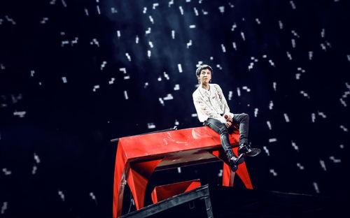 在舞台上,华晨宇总是充满活力,他的歌声充满力量,让人仿佛置身于音乐的海洋。他的舞蹈动作优美,充满力量,让人目不暇接。他的每一次表演,都能让观众感受到他对音乐的热爱和执着。